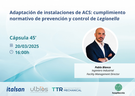El pasado 20 de marzo tuvo lugar el webinar titulado Adaptación de instalaciones de ACS: cumplimiento normativo de prevención y control de Legionella”, organizado conjuntamente con Hospitecnia y enfocado en instalaciones sanitarias.